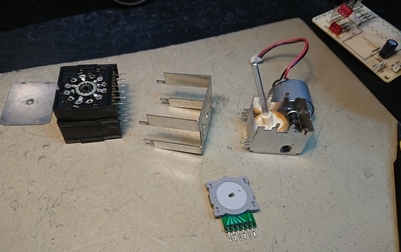 Hier der Motorbetriebe Eingangssteller. Oben links der schwarze Block ist der eigentliche Schalter, der durch eine Welle, die zu einem Motor führt bewegt wird. Nicht zu übersehen, die Kontakte glänzen wieder wie neu, da der Eingangssteller hier auf dem Bild bereits überarbeitet wurde. Vorne mittig ist der Rotary Encoder zu sehen, der der Systemkontrolle übermittelt, wo der  Eingangsteller sich gerade befindet, welche Kanal gerade durchgeschaltet ist.