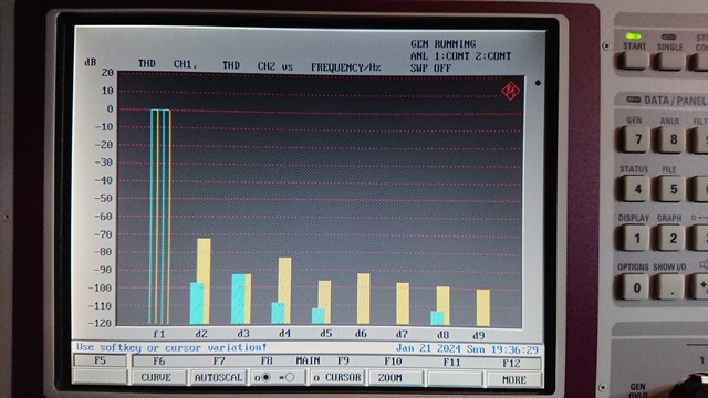 Bei dieser Messung viel ein Kanal aus den Rahmen (gelb), der Klirr lag weit über dem was der Hersteller für dieses Gerät angegeben hat.